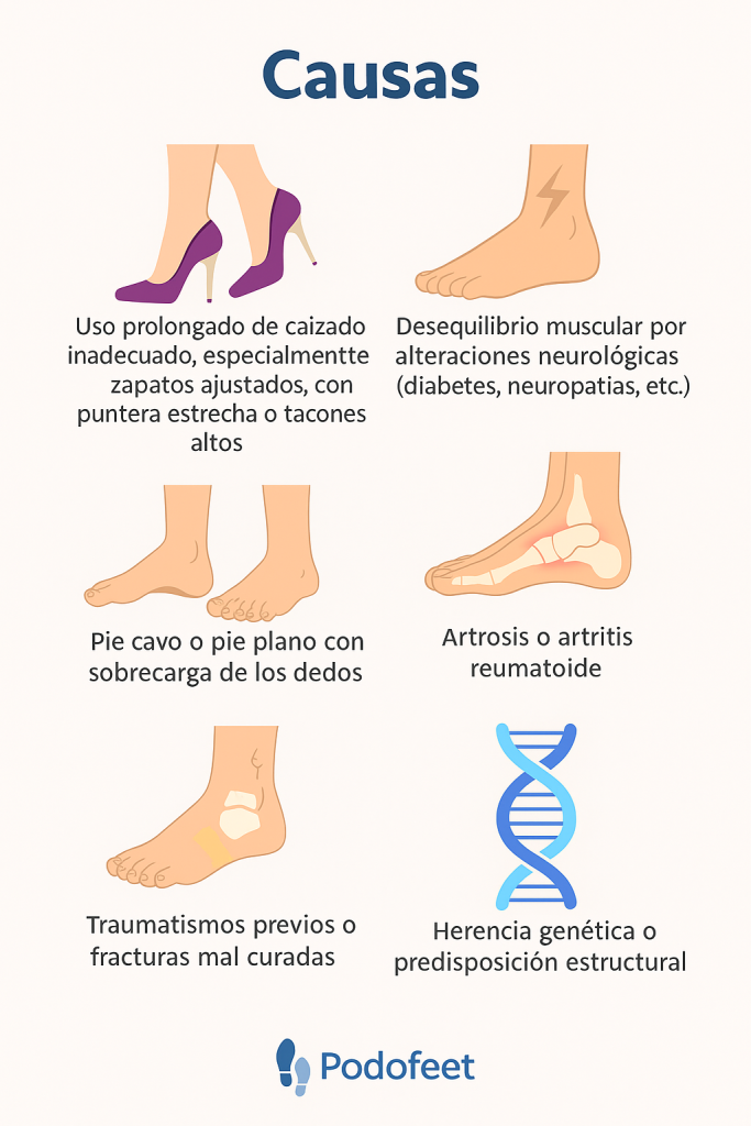 Los dedos del pie tienen articulaciones que les permiten flexionarse y extenderse con cada paso. Sin embargo, cuando hay un desequilibrio entre los músculos, tendones o estructuras óseas que los controlan, pueden desarrollar deformidades estructurales y funcionales.