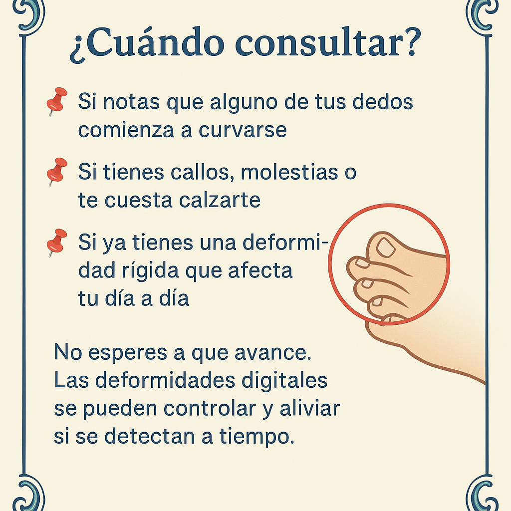 En nuestra clínica, te ofrecemos un enfoque humano, integral y profesional para tratar las deformidades digitales del pie. Nuestro equipo está capacitado para brindarte soluciones personalizadas que te permitan volver a caminar con comodidad y sin dolor.