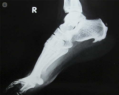 En esta radiografía se observa un “saliente puntiagudo” desde el talón hacia el interior del pie, indicando la patología de espolón calcáneo. Si en las pruebas no aparece dicha calcificación, se trata entonces de fascitis plantar.